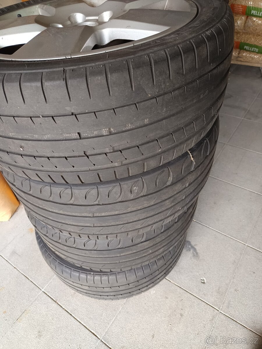 Nabízím originální kola s pneu , pasují na Superb, Passat i Octavii, vzorek 4-5 mm, 225/45-5x112, kola mají kosmetické vady (proto ta cena), ale nebyly nikdy svařované či ,,trefenné,, a podobně