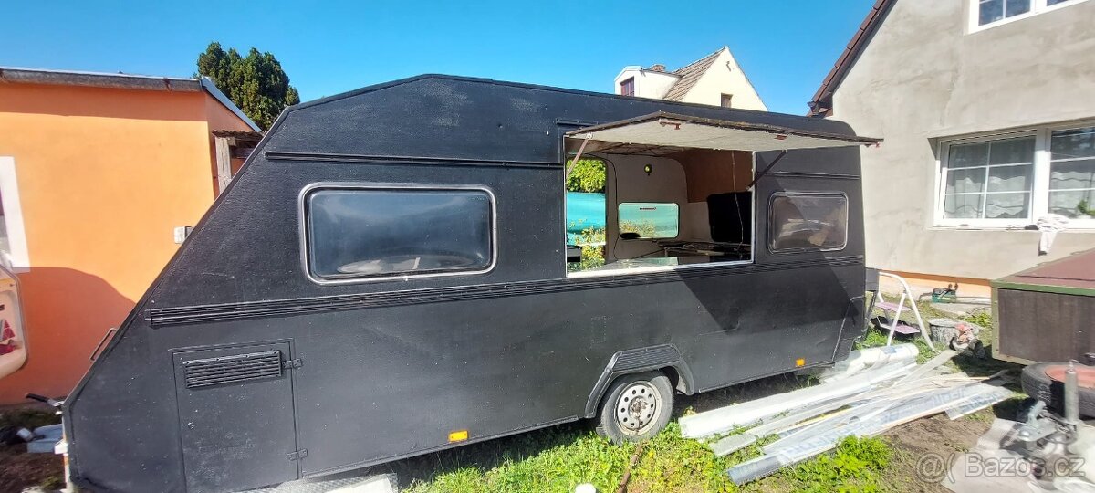 Karavan, občerstvení, prodejna - [13.3. 2026]Pojizdná prodejna originální DDR výroba doklady platné STK,karavan je vybaven hliníkovým oknem které jde otevřít a okna vyndat, světla a elektryka fungují,800 kg lze tahat ze skupinou řidičský průkaz B