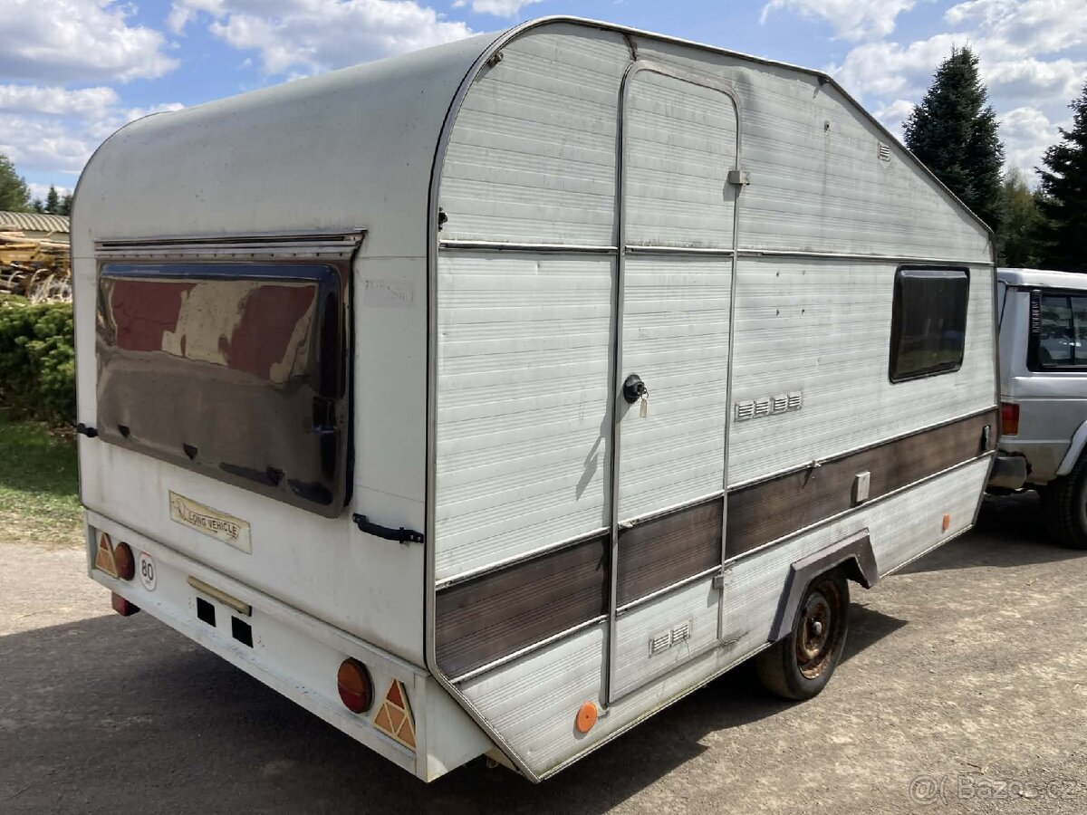 Karvan Sportjacht - [22.4. 2026]Obytný karavan s předstanem, lednička, vařič, zásobník na vodu, pojízdný na značkách bez platné stk