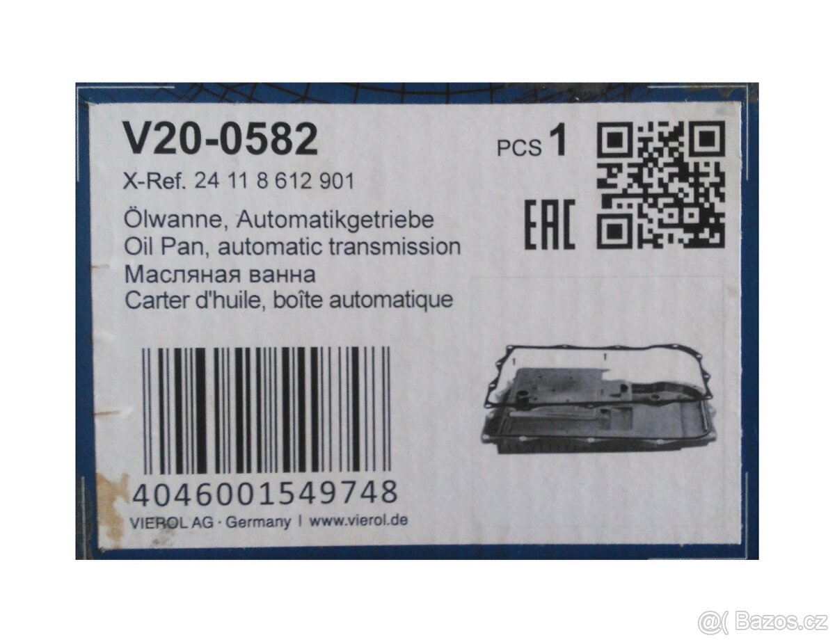 Prodám novou nevybalenou olejovou vanu automatické převodovky značky VAICO V20 – 0582, Ref. 24 11 8 612 901. Součástí balení je i těsnění. Určeno pro vozy Alfa |Romeo, BMW, Chrysler, Dodge, Iveco, Jaguar, Lancia, Land Rover, MAN, Maserati, VW, nabídněte cenu