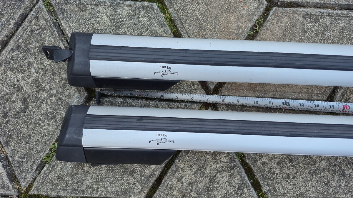 Prodám hliníkové příčníky s T- drážkou na hagusy. Octavia, Fabia apod. Uzamykatelné koncovky, 1 klíč