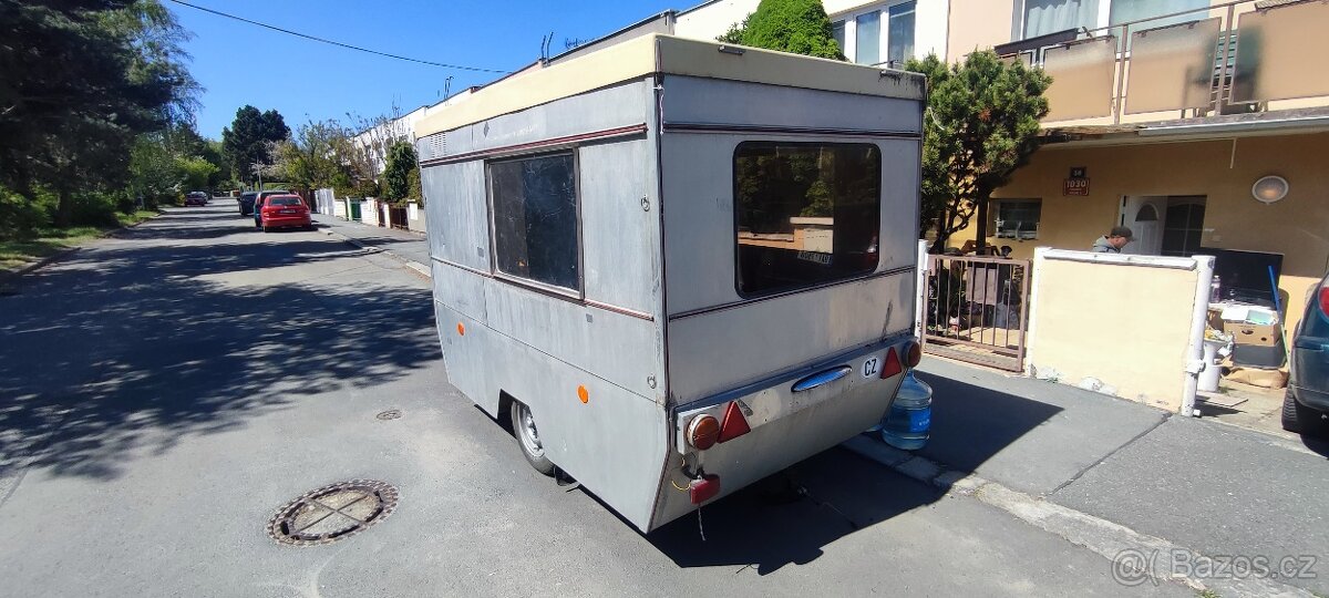 N126 - [16.4. 2026]Prodám polský karavan, na mne je moc malý, v pozadí náhrada. Nemá štítek, VIN ani doklady. Interiér vyčištěn, neteče do něj, dá se uzavřít.